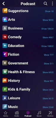 • A total of 110,000 radio stations in MP3 and AAC format, and 1,900,000 podcasts, sorted by country and genre