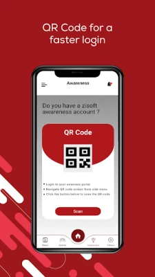 • Login with your ZiSoft Awareness user account where you can access all app features using your ZiSoft Username and Password or via QR Code