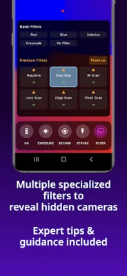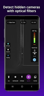 Disclaimer: Detecting a response from the app's detector does not guarantee that an object is a hidden camera. Responses may also occur for other electronic devices and metal objects. Always conduct a hands-on inspection and consult an expert for confirmation. This app should be used as an aid for detecting hidden cameras.