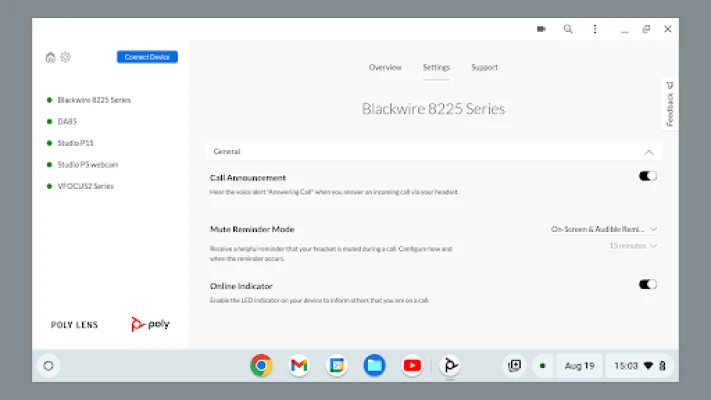 Unlock the many amazing capabilities of your favorite Poly Bluetooth® and USB devices with the Poly Lens Web App. One click is all you need to access device settings to personalize your audio & video experiences, enjoy the built-in wellbeing features, and get help when you need it.