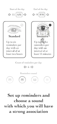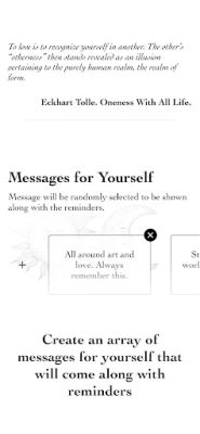 Create an array of messages that you would like to receive from yourself throughout the day. They will come along with reminders to be awareness. Specify what time your day starts and ends, select the number of reminders and the sound with which you will have a strong association.